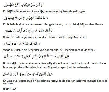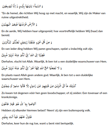 “En de hemel, die richtten Wij hoog op met macht, en waarlijk, Wij zijn de Maker van ruime uitgestrektheid. En de aarde, Wij hebben haar uitgespreid; hoe voortreffelijk hebben Wij (haar) dan bereid. En van ieder ding hebben Wij paren geschapen, opdat u