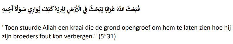 De kraai wordt genoemd als een voorbeeld van iemand die de grond open graaft. Baḥatha fīl-arḍ بحث االرض ف betekent iets blootleggen of iets zoeken. Vogels leren de mens dat er geen